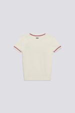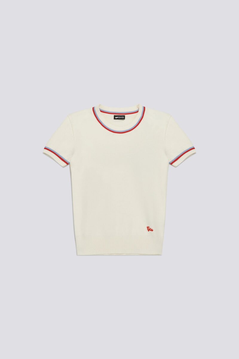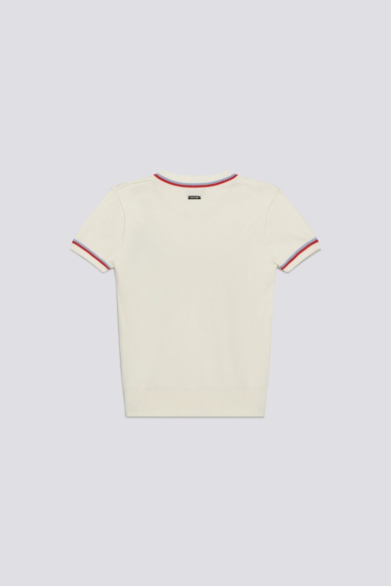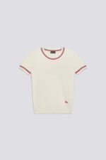 Dámsky tričkový pulóver s okrúhlym výstrihom a krátkym rukávom z jemnej viskózovej priadze s hustotou 12. Pruhovaný lem na golieri a okrajoch rukávov dodáva grafický detail inšpirovaný dedičstvom, vďaka čomu je kúsok okamžite rozpoznateľný. Úzky strih vytvára definovanú siluetu, zatiaľ čo ľahká priadza je ideálny pre rafinované, no zároveň ležérne letné outfity, ktoré sa hodia k džínsom, nohaviciam na mieru alebo pod ľahkú bundu. Zloženie: 72 % viskóza, 28 % polyester